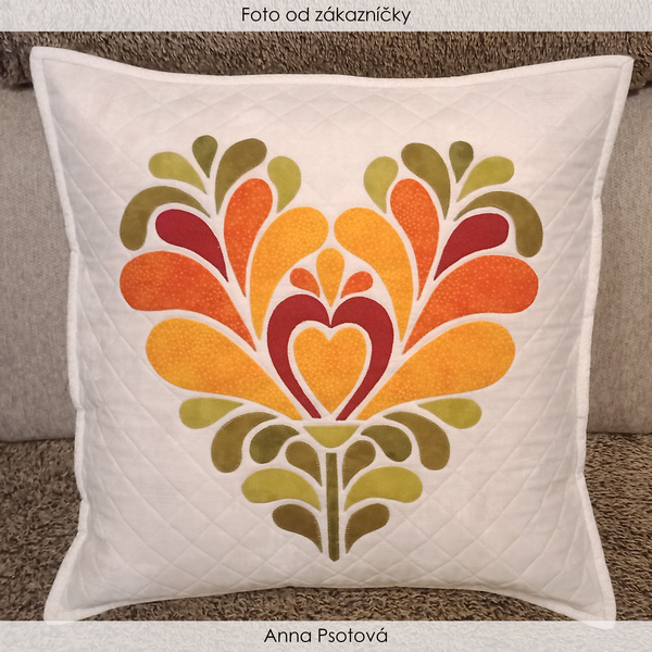 POSTUP: Šablónku vytlačte v skutočnej veľkosti (100%) na papier A4. Ak je rozdelená na dva alebo viac hárkov, spojte ich lepiacou páskou tak, aby vznikol požadovaný vzor. Predtlačený motív vyrežte alebo vystrihnite a prekreslite na podkladovú látku. Jednotlivé prvky vystrihnite z látky (v rôznych farbách alebo v jednej kontrastnej farbe k podkladu), priložte ich na vyznačené miesto a prišite ľubovoľným stehom.
